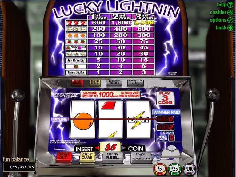 The payouts in Lucky Lightning Slots are pretty generous. Players who land three blanks across the center reel will get up to three coins. If a player lands only one cherry, they will get up to six coins. If a player can land three plain bar symbols in Lucky Lightning Slots, they will take home up to 15 coins, with three lightning bolt symbols paying up to 30 coins. Combinations of two cherries or three plums will pay out up to 45 coins, while three cherries alone will pay out up to 75 coins.